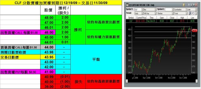 | 交易: | 以每股$1.98買 CLF 12/19/09 到期履約價 $44 的買權CALL, 同時以每股$1.08賣12/19/09 到期履約價 $46 的買權CALL, 加上以每股$0.90賣12/19/09 到期履約價 $41 的賣權 PUT. 此綜合交易沒有收入或支出($0.00). | |