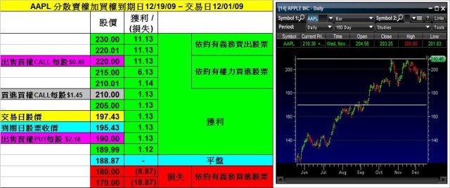 | 交易: | 以每股$1.45買 AAPL 12/19/09 到期履約價 $210 的買權CALL, 同時以每股$0.45賣12/19/09 到期履約價 $220 的買權CALL, 加上以每股$2.18賣12/19/09 到期履約價 $190 的賣權 PUT. 此綜合交易淨收入為$1.13. | |