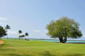 Mamala灣球場位於珍珠港邊, 風景甚是美麗, 球場狀況約80分. 打球時, 不斷的聽到民航機, 直昇機和戰鬥機起飛降落的聲音, 也看到直昇機, 戰鬥機隊伍飛行訓練, 十分有趣. 兩組打完球後在餐廳會合吃午餐, Cate在2年休桿後, 竟然與Francis同在男生Tee發球, 打敗Francis. 餐廳裡的兩位東方女士, 聽到我們說中文, 和我聊了幾句, Larry說, 他們可能是跟著美軍撤出台中清泉崗的台灣人. 餐廳的東西不難吃.