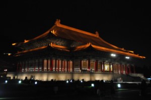 因為時差, 半夜醒來, 薇薇安抱著她的iPad看免費下載的武俠小說, 安東尼則記載此行所見所聞. 今天又去了游泳池, 其它時間睡睡醒醒, 調整時差, 就這樣過了大半天. 晚上大舅子打麻將去, 大舅媽(薇薇安的大嫂)帶我們到杭州南路的盛園吃麵食. 盛園類似鼎泰豐, 當然不如鼎泰豐的美味, 但價位便宜多了, 價錢和美味合併考慮, 兩家可說不分上下. 晚餐後, 經過中正紀念館區域, 夜色下, 頗是美麗.