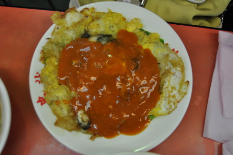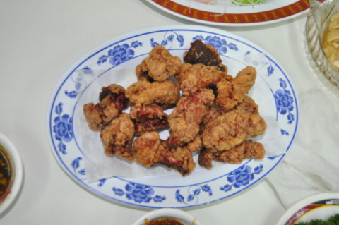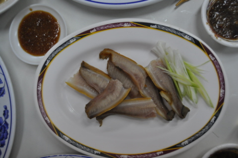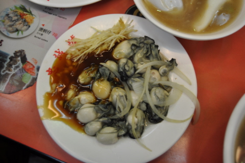 薇薇安經由網路事先找了家海鮮餐廳五郎海產, 我們藉著已下載到iPad的地圖, 找到這家不起眼的地方. 所有海產看起來都很新鮮. 點完上菜後, 計包含黑鮪魚生魚12片, 炒鯊魚皮, 炸紅醩鰻魚, 燙小章魚, 黑毛魚烤和miso湯兩吃, 加上炒飯和炒麵. 老板看到安東尼猛拍照, 可能想是個美食評論家, 趕快送了我們一盤鯊魚煙. 我們估計這一頓可能要花$3,000以上, 帳單一來, 是$1,900, 真是又好吃又便宜, 安東尼正重推薦, 路過基隆火車站, 一定要找到這家店.