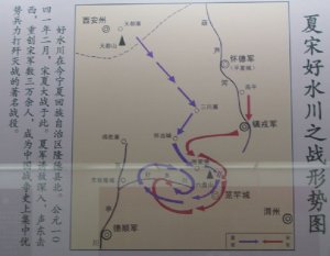 館中的另外一幅看板,引起了我的好奇,它是「夏宋好水川之戰形勢圖」。夏宋之間戰事頻繁,其中最著名的三大戰役:三川口之戰、好水川之戰、定川砦之戰,此三役西夏均取得了大勝。尤其是好水川之戰,宋軍除大將韓琦,尚有羌人譽之為「龍圖老子」的范仲淹大學士坐陣,這位「胸中自有數萬甲兵」的儒將,亦不敵西夏誘敵之計。此役重創宋軍三萬餘人,成為中國古代戰爭史上集中優勢兵力打迂迴殲滅戰的著名戰役。