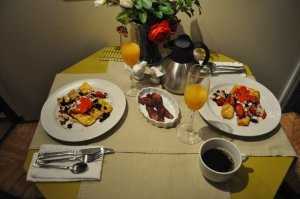 Portland今天清晨溫度在攝氏10度以下, 民宿內的暖氣充足, 感覺舒適溫暖. 習慣早起的我們, 看看電視, 上上網了一陣子, 直到與Dave約好7:30早餐時間, Dave準時敲敲廚房與房主住家相隔的門, 他端來女主人Margaret準備的豐盛有機早點, 秀色可餐 – 煎蛋捲omelette, 麵包, 澄汁, 小圓球水果. 早餐後, 我們花了些時間, 又逛了女主人設計的英國式庭院 English Garden, 天氣寒冷, 穿著厚外套都感覺到寒氣.
