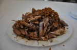 中午退房時,問了櫃台服務人員附近好吃的餐廳,她竟然想不出任何一家,說是酒店裡的也不錯,我們只好準備寄放行李後,就近用餐。走到寄放行李處,服務小弟說他聽到我們與櫃台服務人員的對話,要我們向後轉,看者對街胡同裡遠處的紅旗,然後建議我們在那掛者紅旗的餐館吃飯。他說,那兒有兩家由兩兄弟分別開的餐廳,是北京第一家民營餐廳,祖先是名人的大廚。他又解釋,餐點好吃,兩個人頂多花個一百多元,若在酒店裡餐廳,可能要花6,7百元。於是寄放完行李,過街往胡同裡走。進了餐廳,果然客滿,顧客看來都是當地上班吃中飯的人口。薇薇安很快的點了四菜一湯,上了菜後發現於旁邊桌的點菜大同小異,薇薇安顯現了點菜功力,點了此餐廳的名菜。