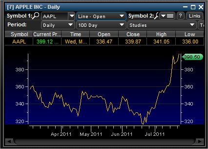 果然,07/19/11當天盤後, AAPL財報又大幅優於分析師們的預測,隔天股票漲至$386.90,07/22/11股價收$393.30. 安東尼成功的運用了看好股栗的Bull CALL Spread,同時買較低履約價,賣較高履約價,相同到期日的CALL策略,短短一星期,每股賺了$6.35 ($380 – $370 – $8.9 + $5.25).