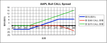 07/18/11當天, AAPL股價約$369, 以每股$8.90買進履約價$370, 到期日07/22/11的買權CALL,同時以每股$5.25賣出履約價$380, 相同到期日07/22/11的買權CALL,此策略付出每股$3.65.