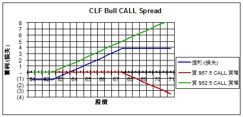 - CLF於10/28/11(失效日當天)收$72.81,高於$63.70, 兩個履約價的買權在到期日10/28/11都以履約價執行;依約,每股以$62.50買進,同時以$67.50賣出,每股買賣獲利$5.00, 減掉此交易所付出$1.20,每股淨賺$3.80 ($67.50 – $62.50 – $1.20)。