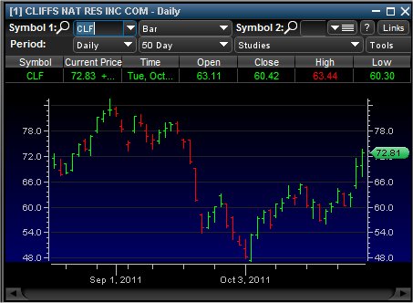 CLF (Cliffs Natural Resources, Inc.)是生產鐵礦的公司,近期鐵礦行業營業狀況看好,CLF在10/27/11股市收盤後發表上季財報。 10/25/11當天, CLF股價約$61,以每股$1.48買進履約價$62.5到期日10/28/11的買權CALL[註一],同時以每股$0.28賣出履約價$67.5的買權CALL。結果,CLF的上季財報亮麗非凡,財報前一天,股價大漲,財報隔日,股價續漲。此交易安東尼下對賭注,大賺一筆。