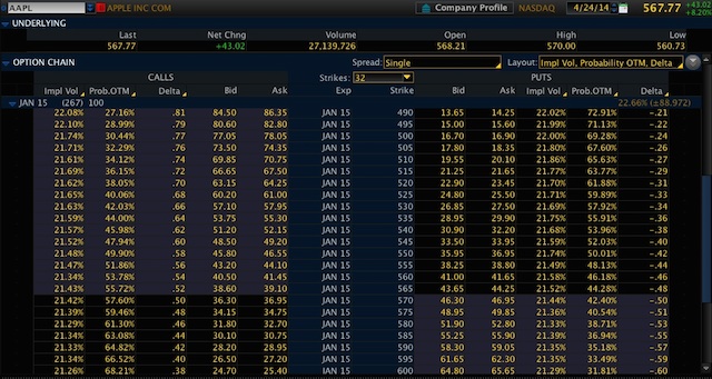 1/10/2014當天,以每股 $82.15 買進 AAPL 履約價$480 失效日 1/17/2015 的買權 CALL (delta 0.70),損益平衡股價約為 $563。這算是較中長期的一種投資。