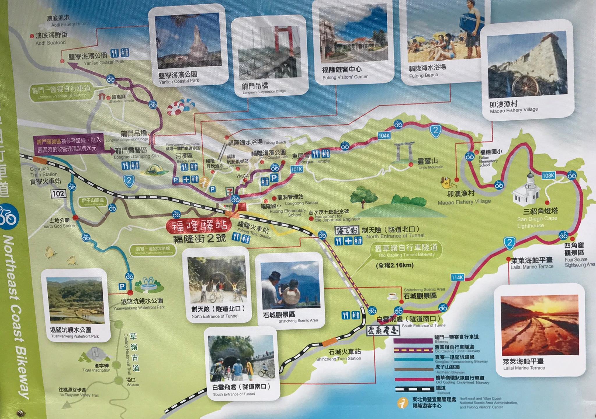 此環狀自行車道全長20公里,若時間足夠,體力能夠應付,抵達東北角海岸線時,眼前美景足以讓人忘記騎車的勞累;不想挑戰全程的人,可以只在隧道中來回騎乘。前往之前,可以 Google 當地腳踏車出租資訊。