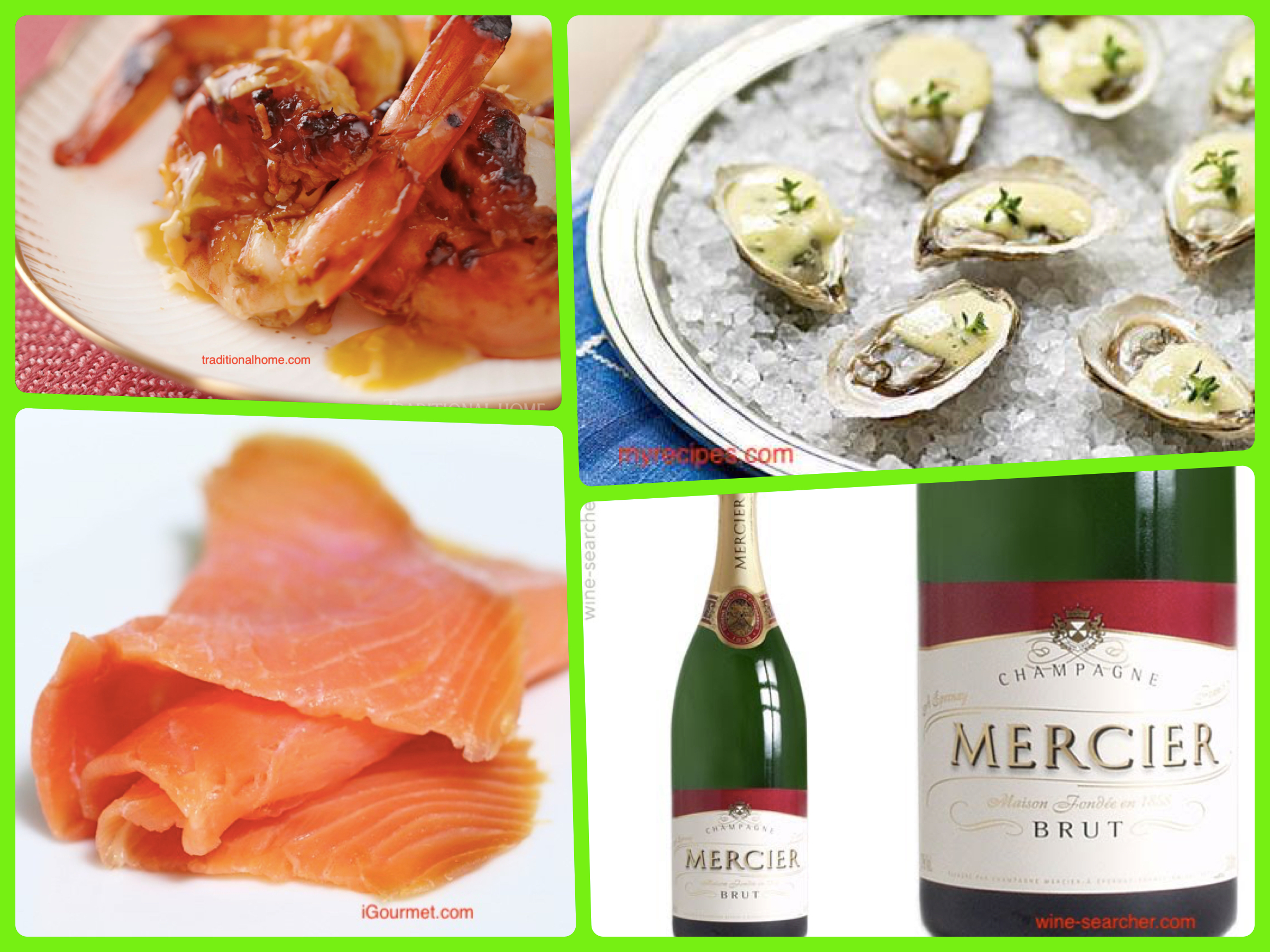 - 淡味與不甜的開胃菜,如淡燻鮭魚、鰻魚、魚醬、魚子等通常可以香檳配對