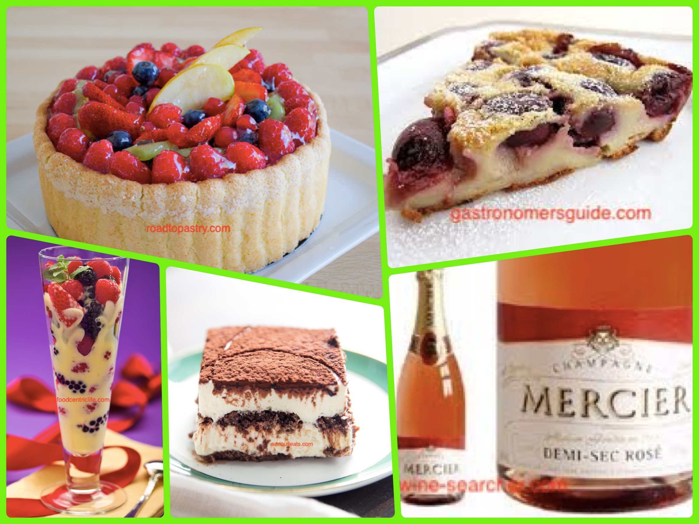 Dry 或 Semi-Dry 香檳相較為甜,適合配對甜點如紅色水果夏洛特 charlotte red fruit、櫻桃塔 cherry clafoutis、提拉米蘇 tiramisu、紅色水果沙巴雍 sabayon red fruit。