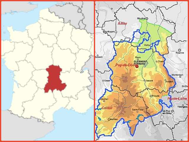 奧弗涅區 Auvergne 自2016年法國重劃行政區域後,屬於奧弗涅-隆河-阿爾卑斯 Auvergne-Rhône-Alpes 大區的一部份,奧弗涅包括 阿列 Allier(03),多姆山 Puy-de-Dôme(63),康塔爾 Cantal(15),與 上羅亞爾 Haute-Loire(43) 四個省,是法國人口最稀少的一區。