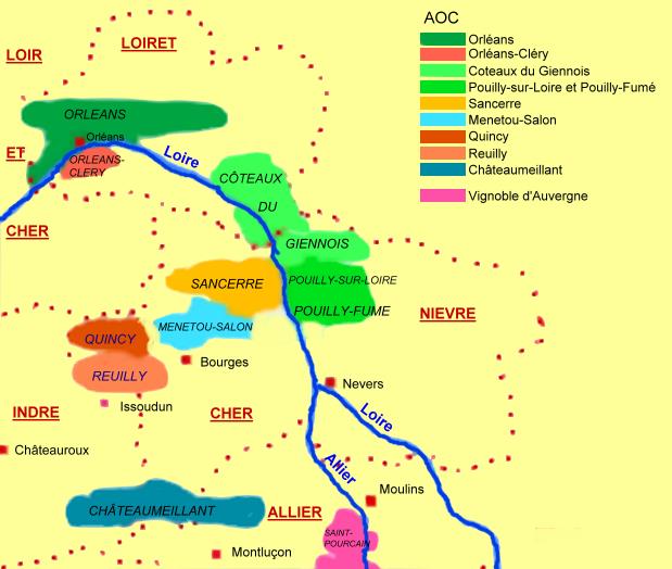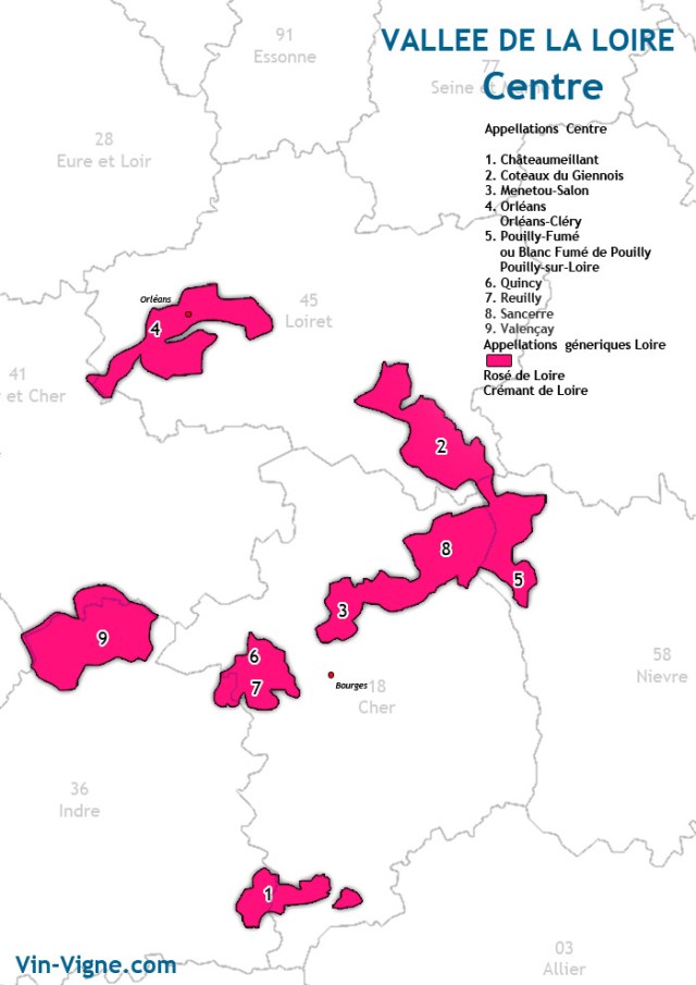 羅亞爾河谷"中央"產酒區的 AOC,其中 AOC Orléans-Cléry 的奧爾良一些城鎮以 Cabernet Franc 釀製紅葡萄酒。有3個 AOC 只生產乾白葡萄酒,包括 AOC Pouilly-Fumé 以蘇維翁葡萄釀製乾白葡萄酒或"煙燻"白葡萄酒;AOC Pouilly-sur-Loire 以 Chasselas 葡萄釀製白葡萄酒;AOC Quincy 以蘇維翁葡萄釀製乾白葡萄酒。其他酒款的 AOC 包括 Orleans,Sancerre,Chateaumeillant,Menetou-Salon 與 Coteaux du Giennois。