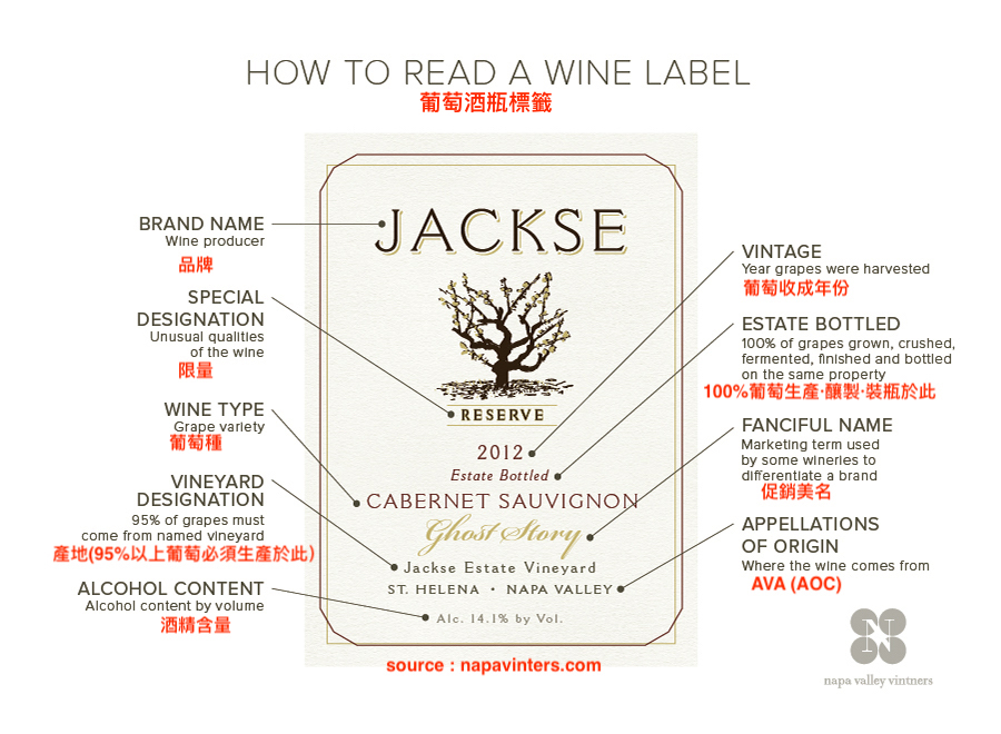 美國葡萄酒瓶標籤標示的內容和方式與法國葡萄酒瓶略有不同, 下圖解釋美國葡萄酒瓶標籤對於該瓶葡萄酒所顯示的資訊 :