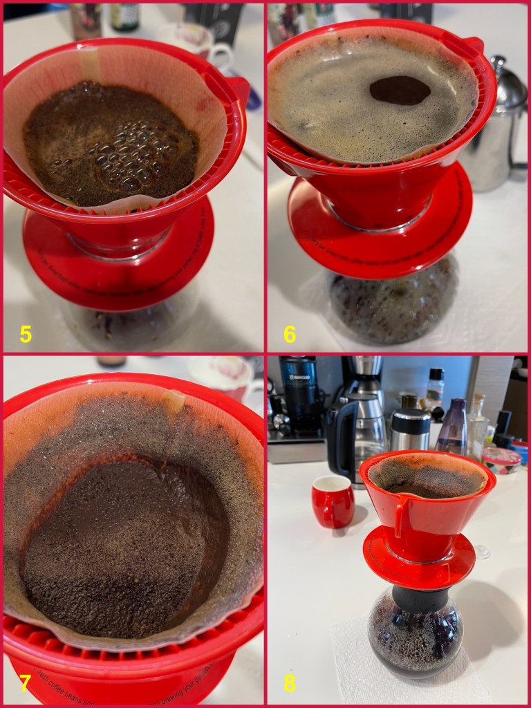 均勻的速度,控制細嘴壺,以圓形活動方式,順時針或反時針方向,倒入熱水,涵蓋整個漏斗的咖啡粉。以一般人的經驗,總共約2分鐘的時間可以沖泡出最美味的咖啡(6)。