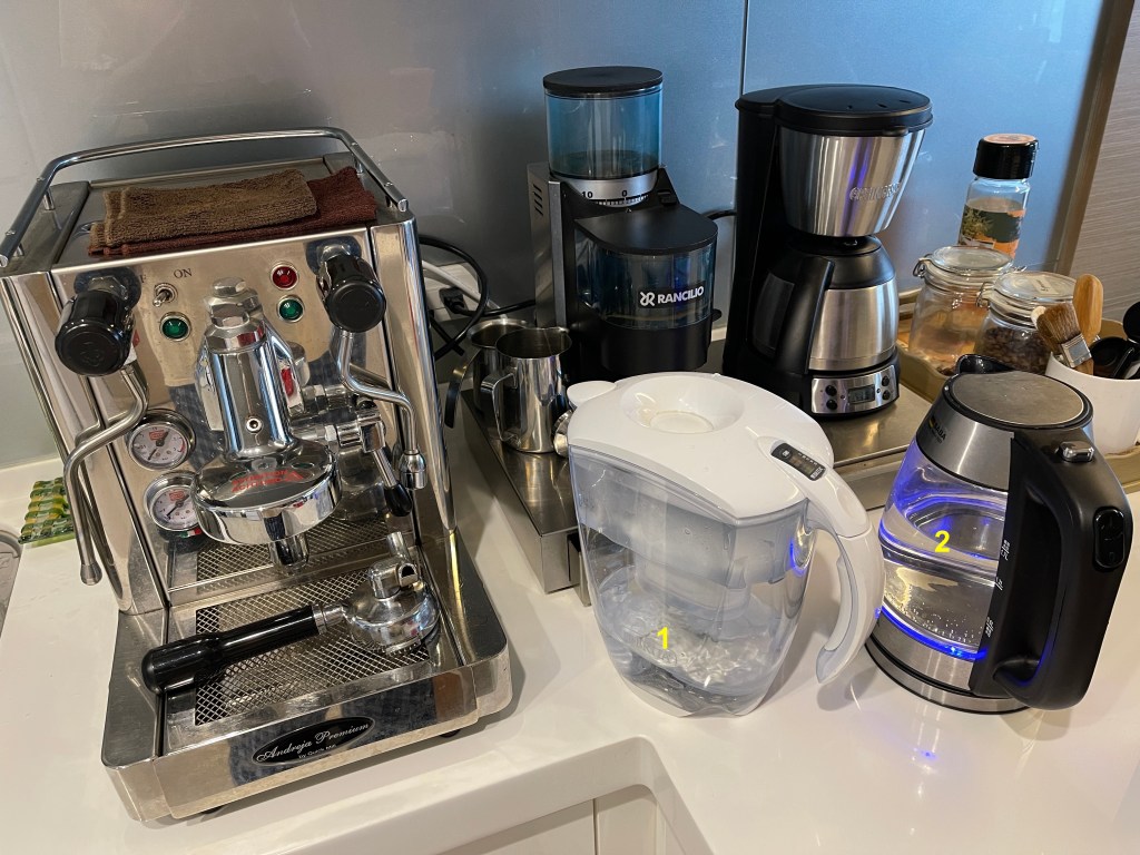 安東尼的咖啡器材種類齊全,包括(1)溫度計(以烤牛排溫度計代用,99.9%時間其實不用),(2) 細嘴壺,(3) 接漏斗的咖啡容器,(4) 可控制流量的咖啡滴濾漏斗,(5) 儲存咖啡豆的密閉容器,(6) 自動滴濾咖啡機,(7) 磨豆機,(8) 義式濃縮咖啡機。