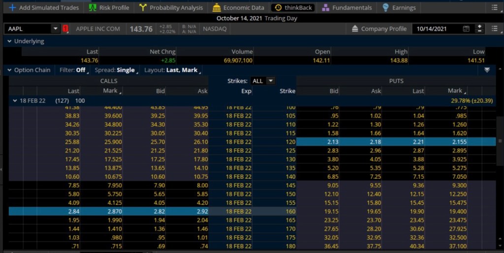 2021/10/14 日當天 AAPL 股價約為 $143,預測AAPL 因有 iPhone 新機出產,當季財報應該亮麗。於是以$2.87 買進財報後 2022/02/18 到期日,履約價 $160 的兩個 CALL 合約,共$574 (不包含手續費)。如果 AAPL 在 2022/02/18 後漲上 $162.87 即可獲利。
