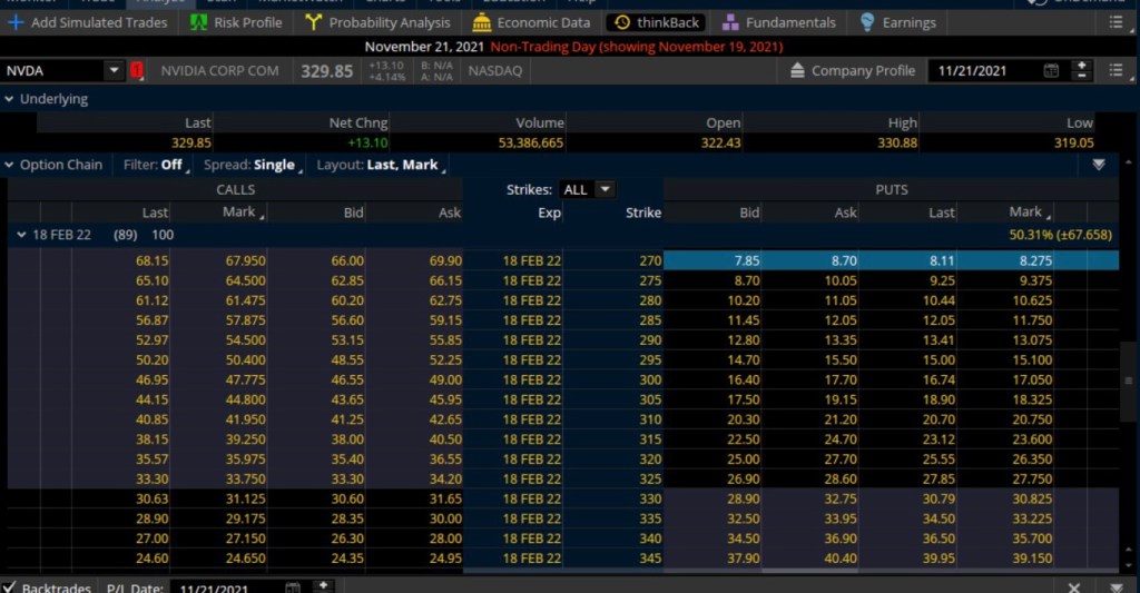 NVDA 雖然是個前途無量的績優股,可是覺得股價短期內漲得太多,不想以目前股價買進股票而持股。2022/11/21當天,NVDA 股價約為 $329,以後願意以 $270 買進股票而持股,於是當天以 $825 賣出 2022/02/18 到期日,履約價 $270 的1個 NVDA 合同。如果 2202/02/18 收盤後股價 $270 以下,將被迫買進 100 股的 NVDA。