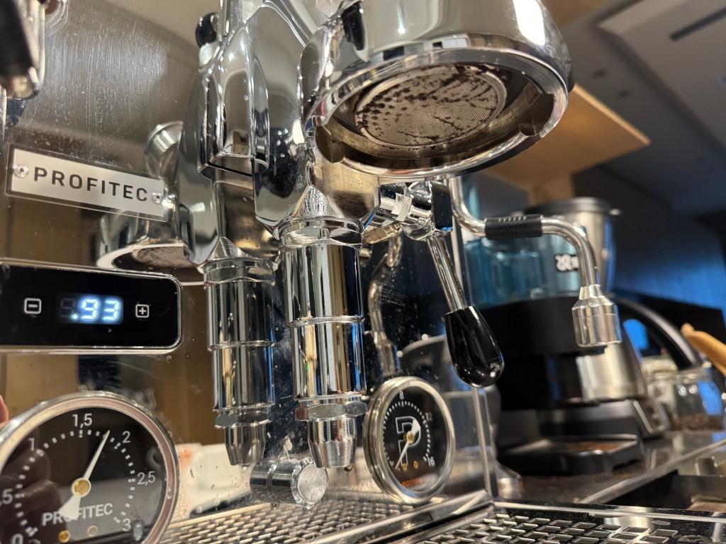我的沖煮溫度設定94°C,看著右下角的沖煮壓力是9大氣壓 9 bars ,沖煮頭上的流量控制壓力稍小,約 8 bars 。沖煮後咖啡味道不錯,我也就不曾去調整流量,至今其實也不知道它的調整功能會如何影響咖啡味道,有容日後再做研究。
