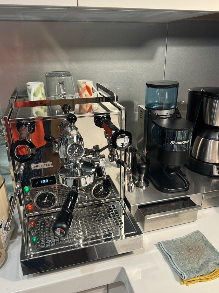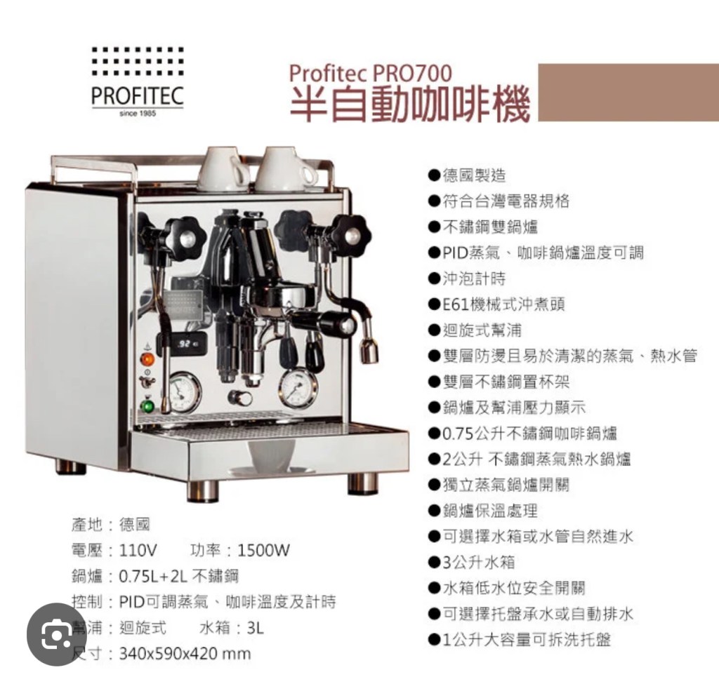 安東尼自年輕時就有咖啡嗜好,20幾年前開始自己烘焙各種咖啡豆和自製各式咖啡,去年覺得玩夠了,不想再多花時間在咖啡上。結果去年底安東尼用了超過10年的義式咖啡機開始發生故障,正好大兒子回台,找了一部幾年前我介紹他在美國買的一部好友研究後,覺得不錯的德國製 Profitec Pro 600 機器。他在網上搜尋後,親自載我到咖啡店買了一部咖啡機當我的聖誕禮物,又燃起了我對咖啡的興趣,因此又買了許多新的裝備。咖啡在台灣算是盛行,各種裝備產品也都不錯,先介紹義式咖啡機 Profitec Pro 700。